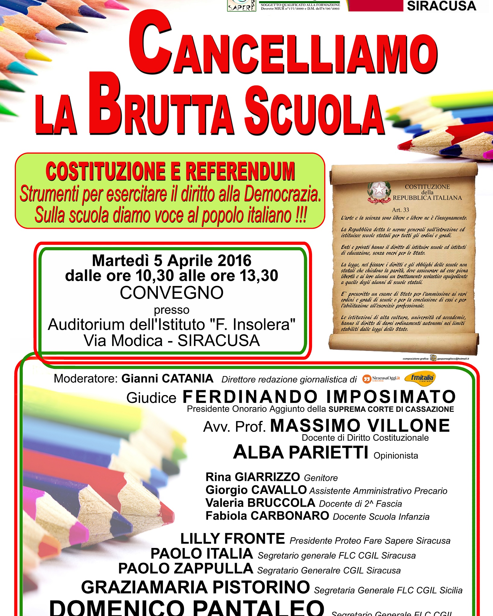 Il 9 e il 10 aprile, in centinaia di piazze italiane avrà luogo l’inizio della raccolta delle firme. Paolo Italia, Segr. Gen. della FLC CGIL di Siracusa, sottolinea: "Per lanciare l'avvio di tale raccolta, il 5 aprile 2016 presso l'Auditorium dell'Istituto "Insolera" di via Modica, abbiamo organizzato insieme a Proteo Fare Sapere, un convegno che vedrà la presenza